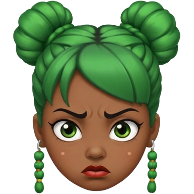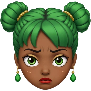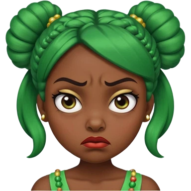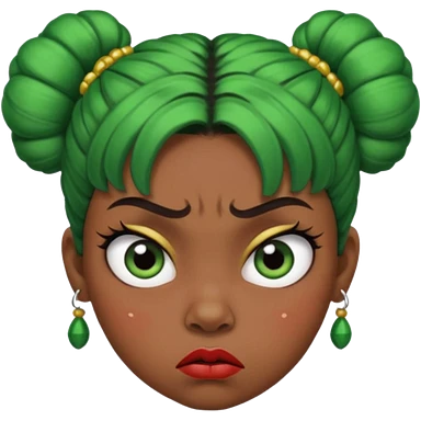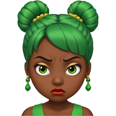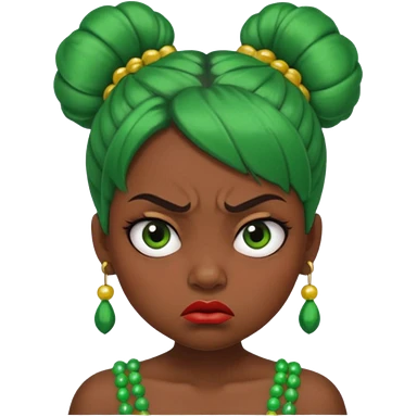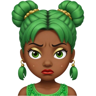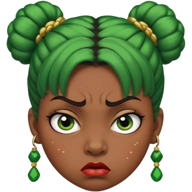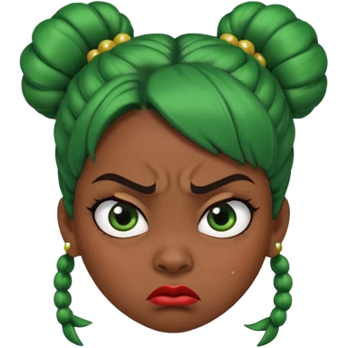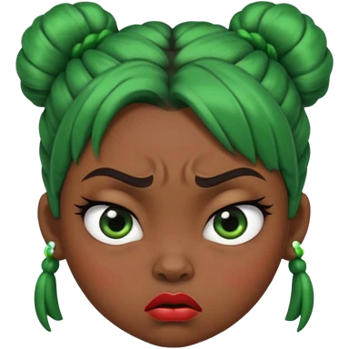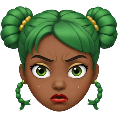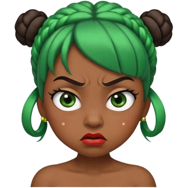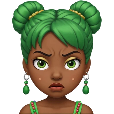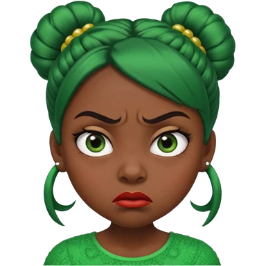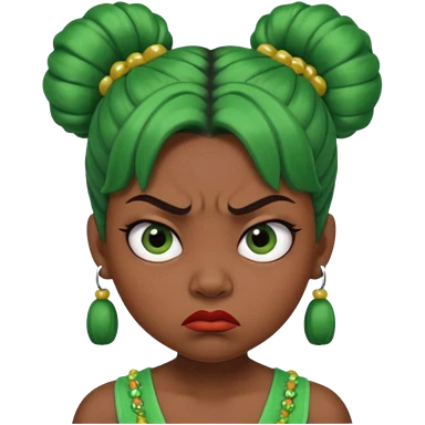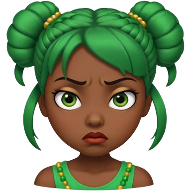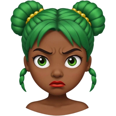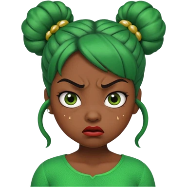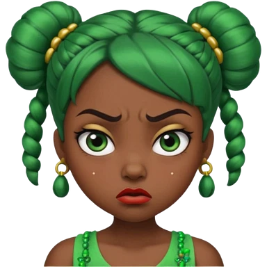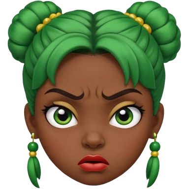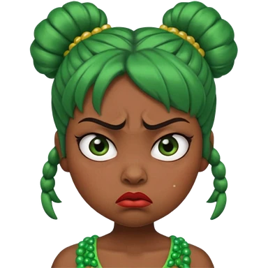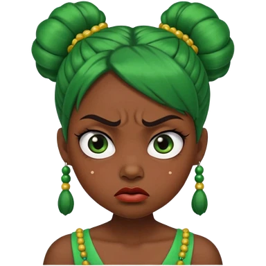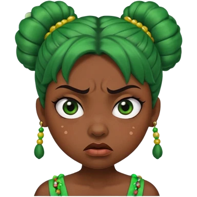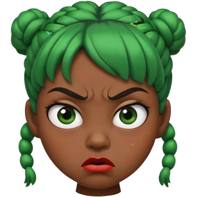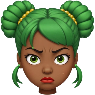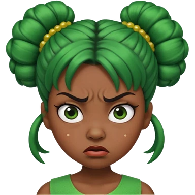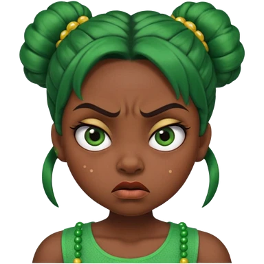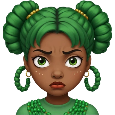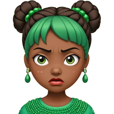 Create a 3D cartoon-style girl character with dark skin, round face, angry expression, big wide eyes, and tightly styled double buns made of green beaded hair. The girl should look irritated, eyebrows sharply angled, and lips pressed in a frown. emoji
