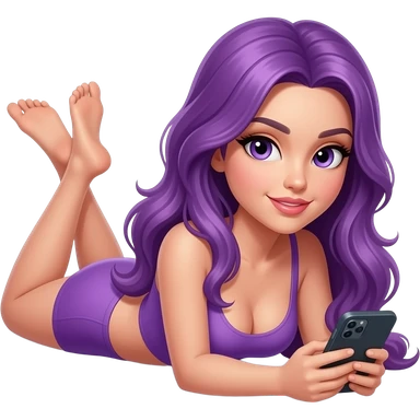 sexy girl with long purple hair is lying on the floor with a cell phone in her hands emoji