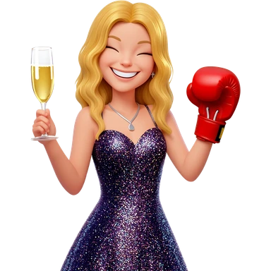 Happy girl, blond girl, party vibe with a glass of champagne and a boxing glove emoji