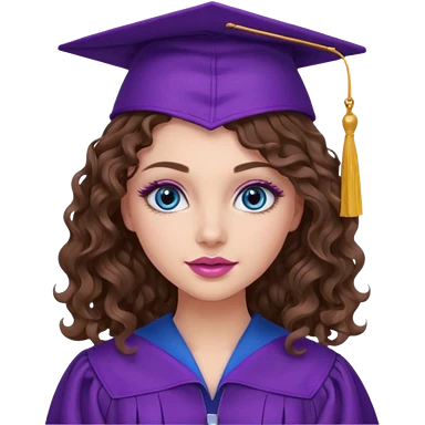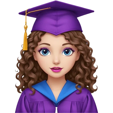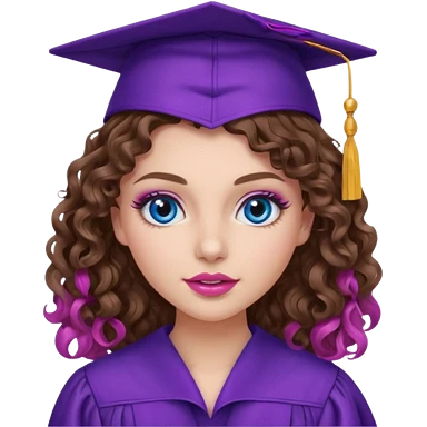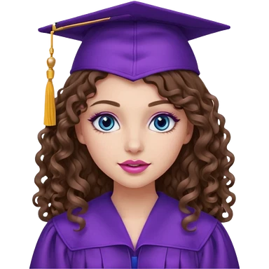 girl with curly and long wavy brown hair, blue eyes, long lashes makeup, sexy pink lips, wearing a purple graduation cap and gown emoji