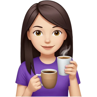 Chocolate straight hair white girl drinking coffee blinking an eye with a smile, purple pastel tshirt emoji