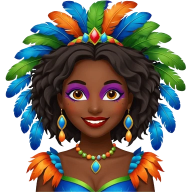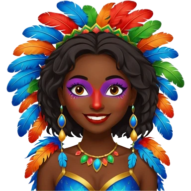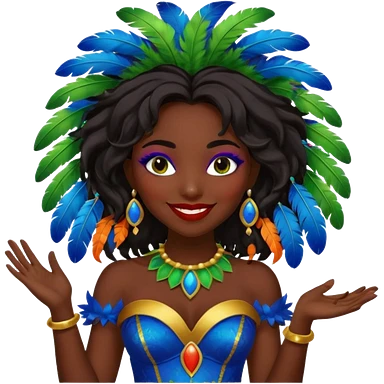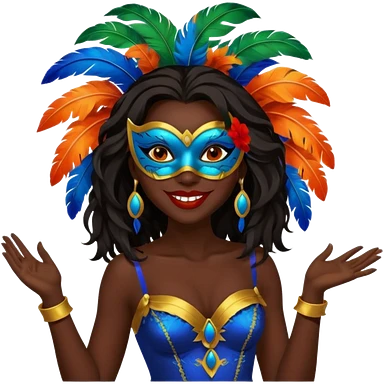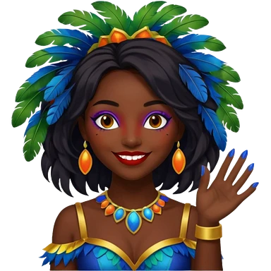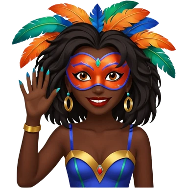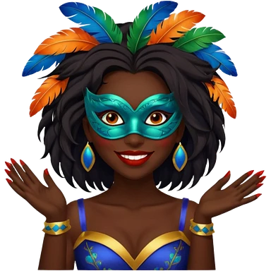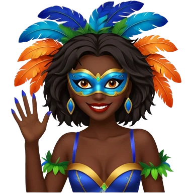 i need the same girl in "dark skin girl, dark red lipstick, nails very beautiful" to be smiling in "carnival mas costume, blue, green and orange preferably, full costume feathers at the back" she is to be smiling, hair should be dark shoulder length, black nail polish on her fingers emoji