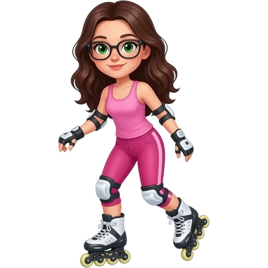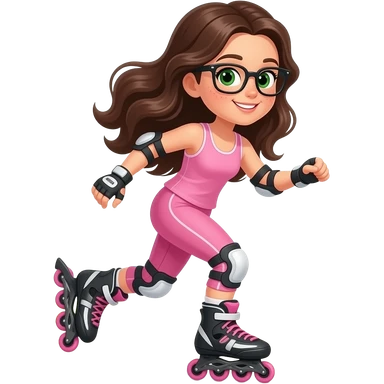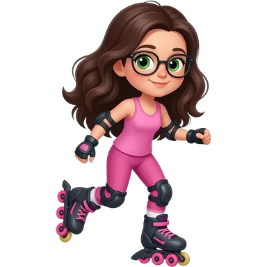 young girl in the style of iphone emoji people, fair skin, green eyes, glasses, freckles,long dark brown wavy hair, pink tank top and pink leggings, rollerblading emoji