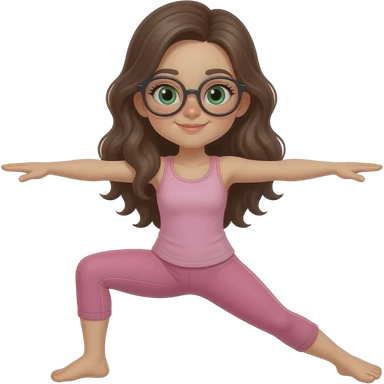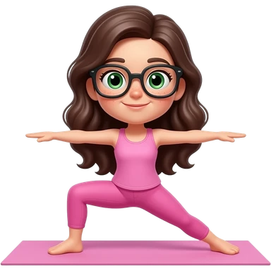 young girl in the style of iphone emoji people, fair skin, green eyes, glasses, freckles,long dark brown wavy hair, pink tank top and pink leggings, do yoga emoji