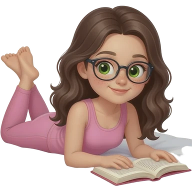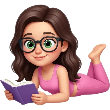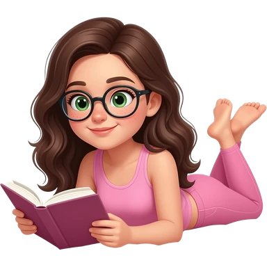 young girl in the style of iphone emoji people, fair skin, green eyes, glasses, freckles,long dark brown wavy hair, pink tank top and pink leggings, looking at book and lies on the bed emoji