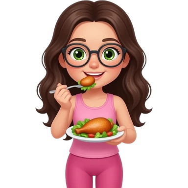 young girl in the style of iphone emoji people, fair skin, green eyes, glasses, freckles,long dark brown wavy hair, pink tank top and pink leggings, he eats chicken steak and salad and wears glasses emoji