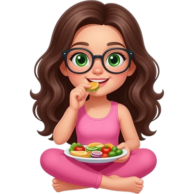 young girl in the style of iphone emoji people, fair skin, green eyes, glasses, freckles,long dark brown wavy hair, pink tank top and pink leggings, eats healthy food emoji