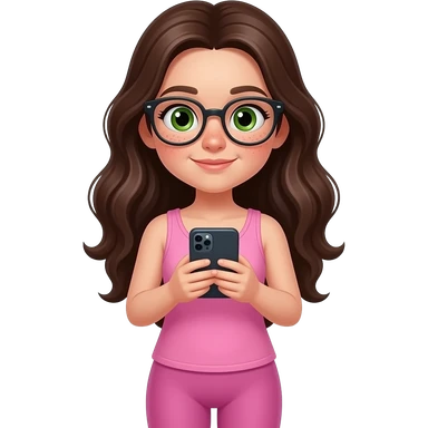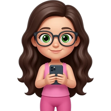 young girl in the style of iphone emoji people, fair skin, green eyes, glasses, freckles,long dark brown wavy hair, pink tank top and pink leggings, looking at the phone emoji