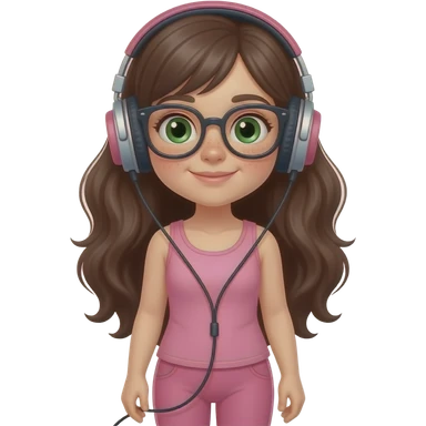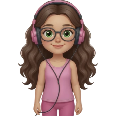 young girl in the style of iphone emoji people, fair skin, green eyes, glasses, freckles,long dark brown wavy hair, pink tank top and pink leggings, listening to music on headphones emoji