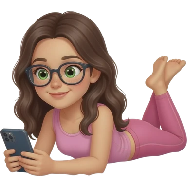 young girl in the style of iphone emoji people, fair skin, green eyes, glasses, freckles,long dark brown wavy hair, pink tank top and pink leggings, looking at the phone and lies on the bed emoji
