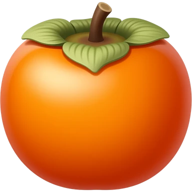 Flat emoji-style persimmon, smooth spherical shape, glossy surface, bright warm orange color, distinct dried brown leafy calyx on top, no side grooves, no ridges, not pumpkin-like, minimal detail, clean vector, iOS emoji style lighting. emoji
