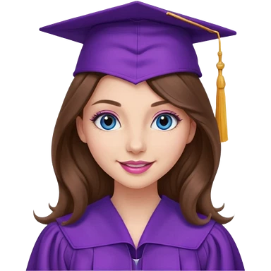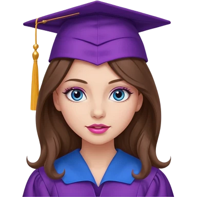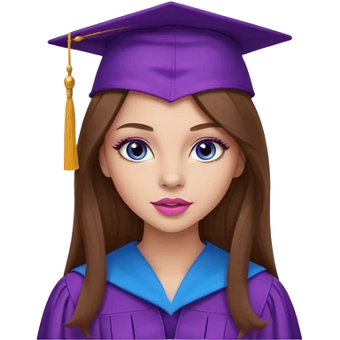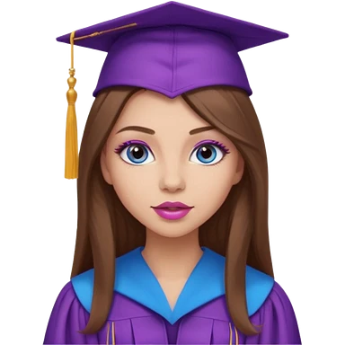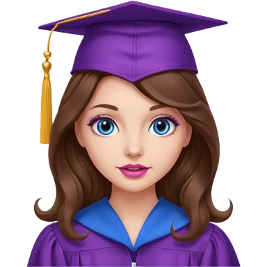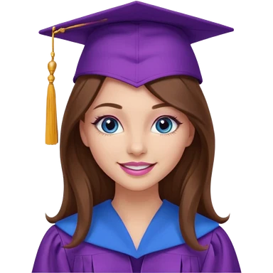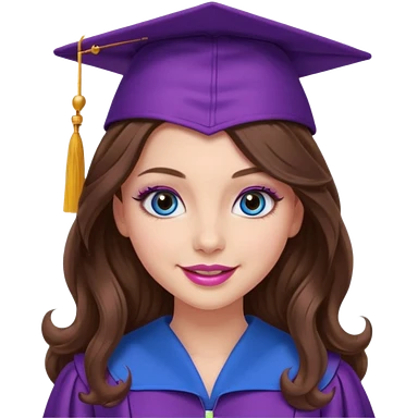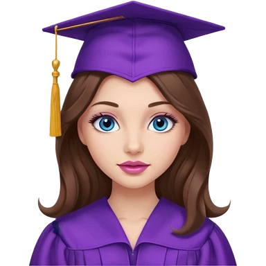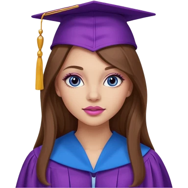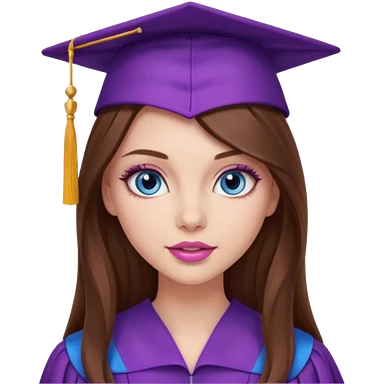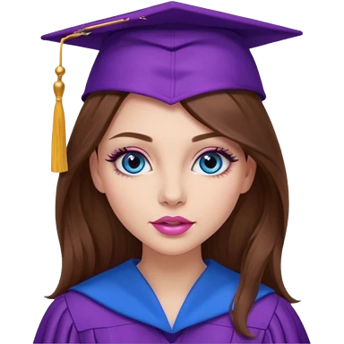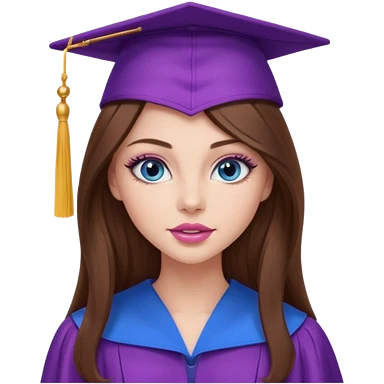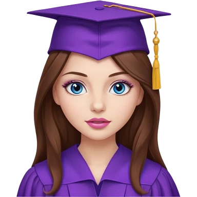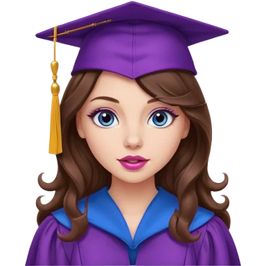 girl with gorgeous long brown hair, blue eyes, long lashes makeup, sexy pink lips, wearing a purple graduation cap and gown emoji | AI Emoji Generator