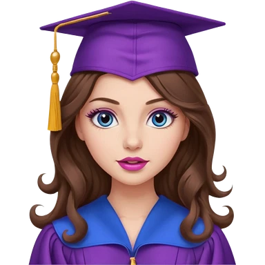 girl with gorgeous curled long brown hair, blue eyes, long lashes makeup, sexy pink lips, wearing a purple graduation cap and gown emoji