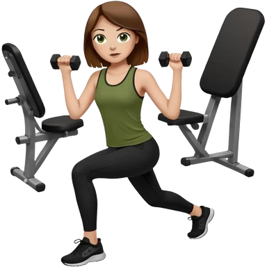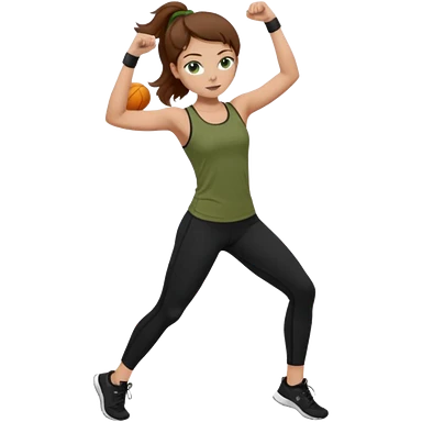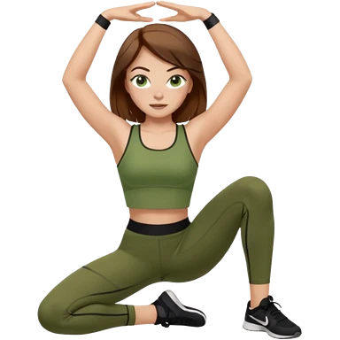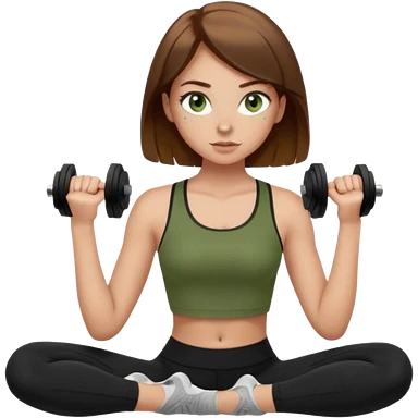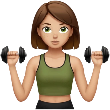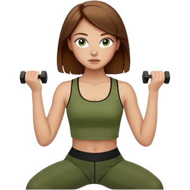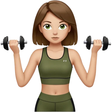Girl with green eyes, brown hair shoulder length, light skin, and freckles wearing an olive green crop top with black leggings working out, she has light gorgeous lashes emoji | AI Emoji Generator