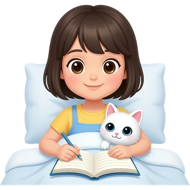 Short hair Asian girl wake up with white cat , sunshine, writing morning journal emoji