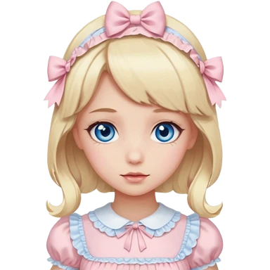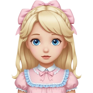 toddler girl with brown eyes and blonde curly hair in two pigtails wearing a baby blue lolita dress with baby pink hair bows emoji