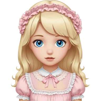 pale girl , who has curly medium length blonde and baby pink swirled hair with bangs , grey eyes , and doll like makeup , in a light pink lolita hime gyaru dress emoji