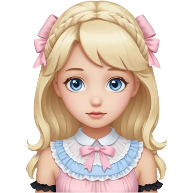 girl , who has straight hair blonde and baby bule swirled hair with bangs , grey eyes , and doll like makeup , in a light pink lolita hime gyaru dress emoji