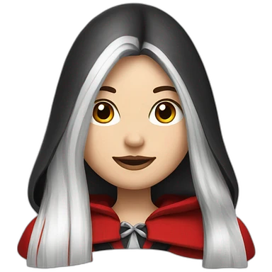 white girl with long straight black hair, white streak in hair, red hooded cloak emoji