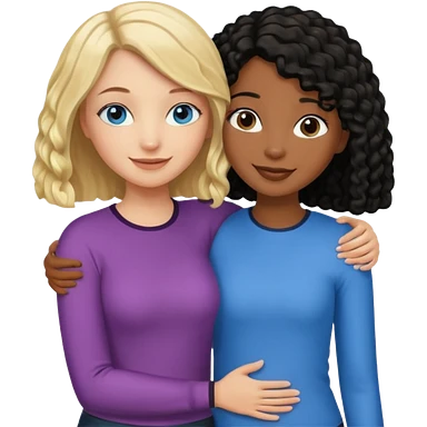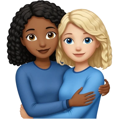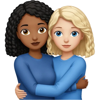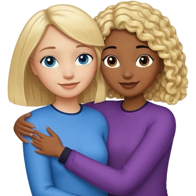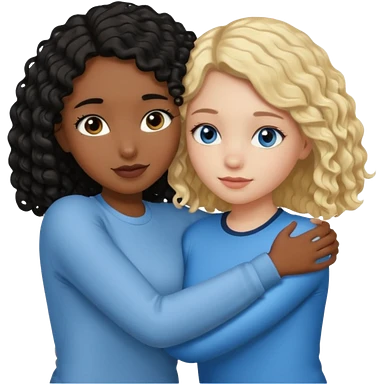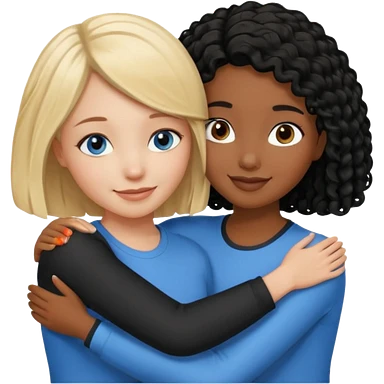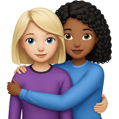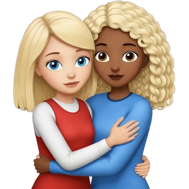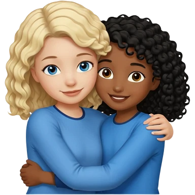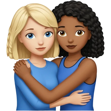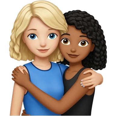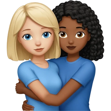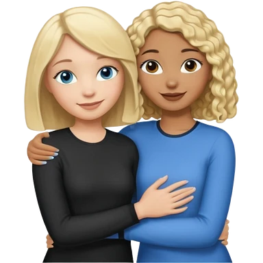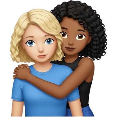 Girl best friends, one white with blond bob and blue eyes, one shorter black girl with long black curly hair, hugging emoji