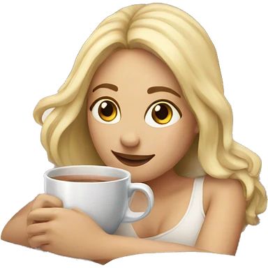 Blonde girl laying in bed with cup of tea and laptop emoji