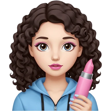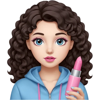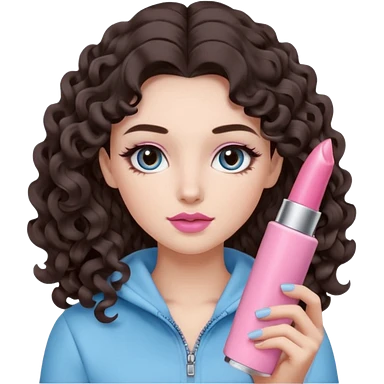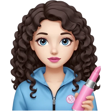 A girl with long dark brown hair styled in loose 36mm curls, round-almond Douyin-style eyes with long curled lashes, cool-tone neutral makeup. She’s wearing a light-blue athletic outfit and holding a normal-size pink lipstick (not oversized) in one hand. emoji