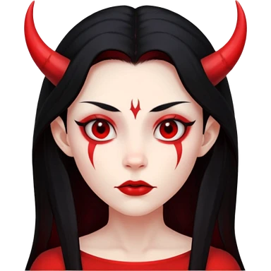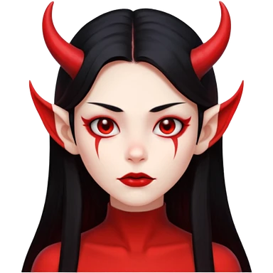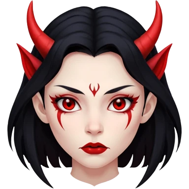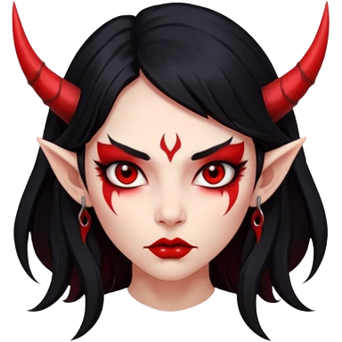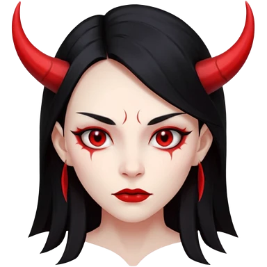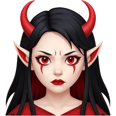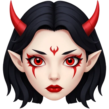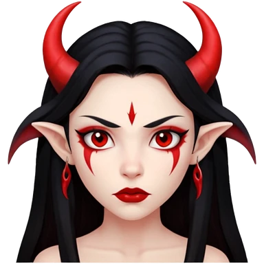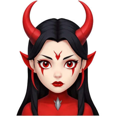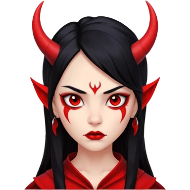 Head only: demon girl, 100% red skin, long black hair, small horns, sharp cheekbones, serious eyes, full lips, pointed ear; centered, no body, no text. emoji