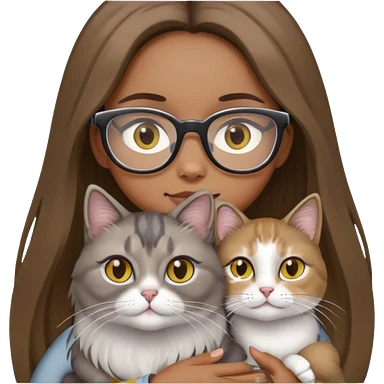 A girl with long straight brown hair and bangs, brown eyes, holding a gray and white calico cat and a tabby cat in each hand emoji