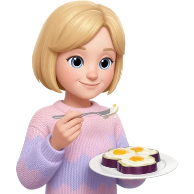 Blonde long hair girl, blue eyes, eating an eggplant emoji