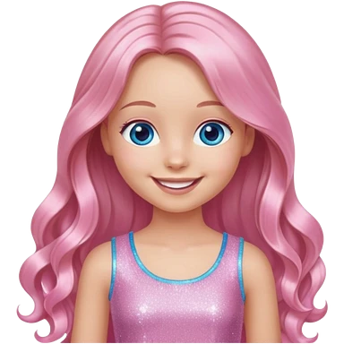 A digital portrait of a girl with long flowing hair, wearing a sparkly pink top, exuding a joyful smile with blue eyes and a gentle, doll-like look emoji