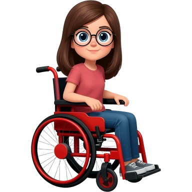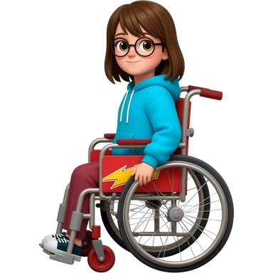 Brown hair girl with circle glasses in a rayo McQueen wheelchair, the wheelchair funnier, more similar to rayo mqeen emoji