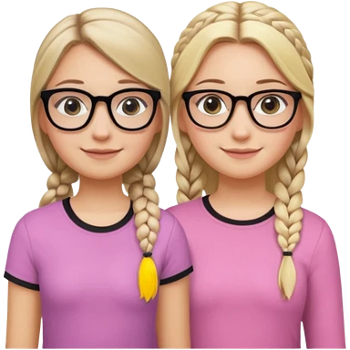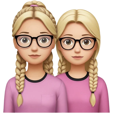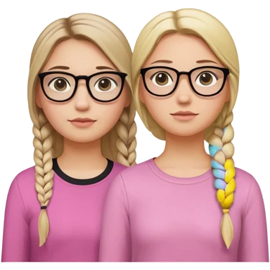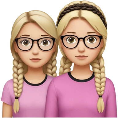 Two girls a taller girl with a black shirt and glasses dirty blonde long hair in a braid and eyeliner, second shorter girl with light blonde shoulder length straight hair with a side part and a pastel pink shirt emoji