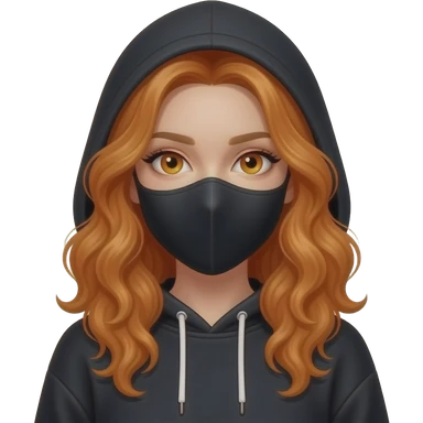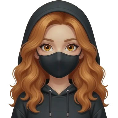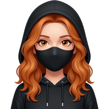 sexy girl with long curly ginger hair and ginger eyes wearing a black hoodie with the hood atop her head and a black mask emoji
