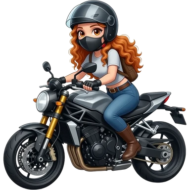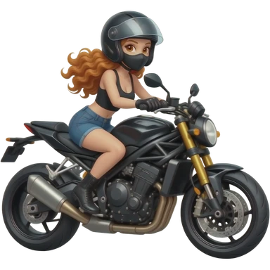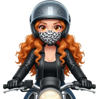sexy girl with long curly ginger hair and ginger eyes is riding a motorcycle wearing a helmet and a mask emoji