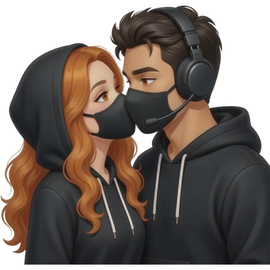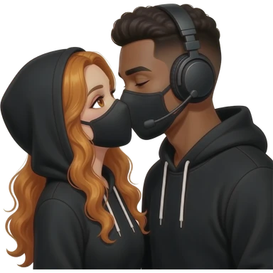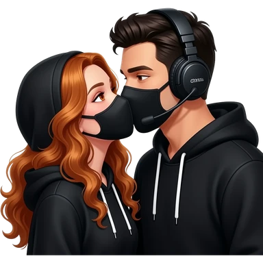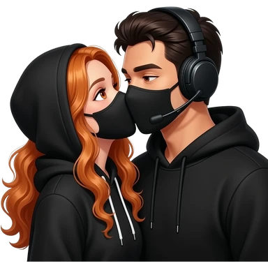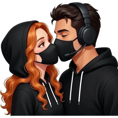 sexy girl with long curly ginger hair and ginger eyes with a black hoodie and mask gets kissed by a attractive blackhaired man with a black hoodie, a headset and a black mask emoji