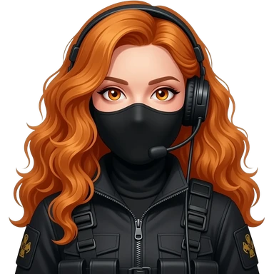 sexy girl with long curly ginger hair and ginger eyes wearing-a-black-special-tactics-medical-force-outfit-and-a-black-combat-boots-plateface-a-black-balaclava-and-wears-a-headset emoji