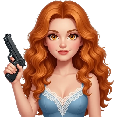 sexy girl with long curly ginger hair and ginger eyes holds a gun emoji
