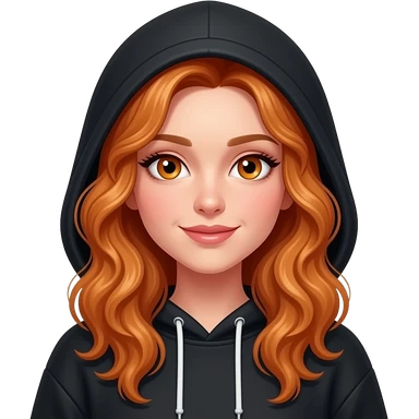 sexy girl with long curly ginger hair and ginger eyes wearing a black hoodie with the hood atop her head emoji