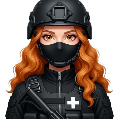 sexy girl with long curly ginger hair and ginger eyes wearing-a-black-special-tactics-medical-force-outfit-and-a-black-combat-boots-plateface-with a-black-balaclava-and-wears-a-helmet emoji