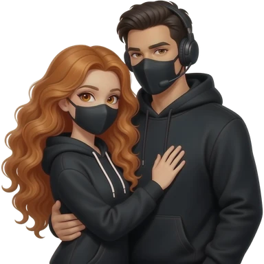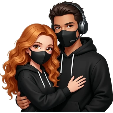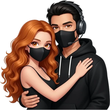 sexy girl with long curly ginger hair and ginger eyes with a black mask gets hugged by a attractive blackhaired man with a black hoodie, a headset and a black mask emoji