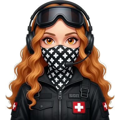 sexy girl with long curly ginger hair and ginger eyes wearing-a-black-special-tactics-medical-force-outfit-and-a-black-combat-boots-plateface-total-painted-black-and-a-black-and-white-patterned-balaclava-and-wears-a-headset-and-a-big-black-night-vision- emoji