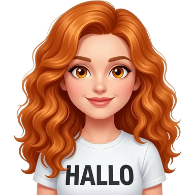 girl with long curly ginger hair and ginger eyes wearing a says HALLO emoji