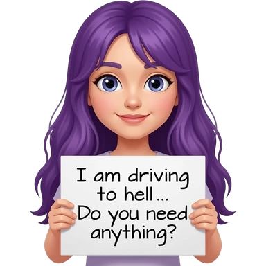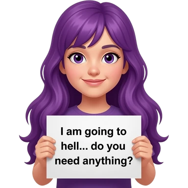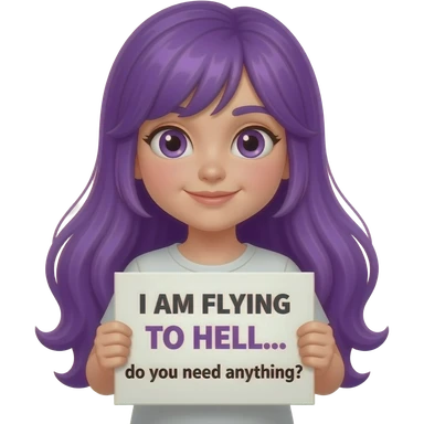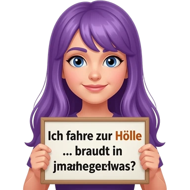 girl with long purple hair holding a ICH FARH ZUR HÖLLE... braucht ihr irgendwas? sign emoji