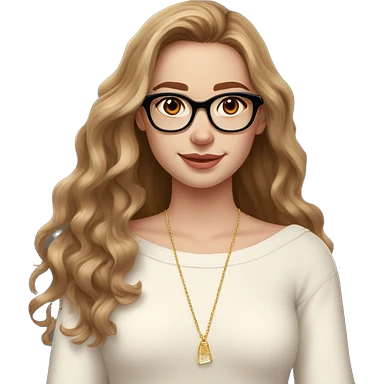 Girl with pale skin, long wavy brown hair with slight orange balayage wearing an off shoulder white sweater, a golden necklace, golden earrings and a pair of rectangular black glasses. She had dark brown eyes emoji