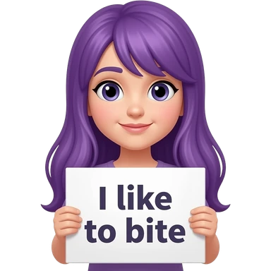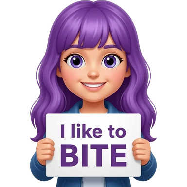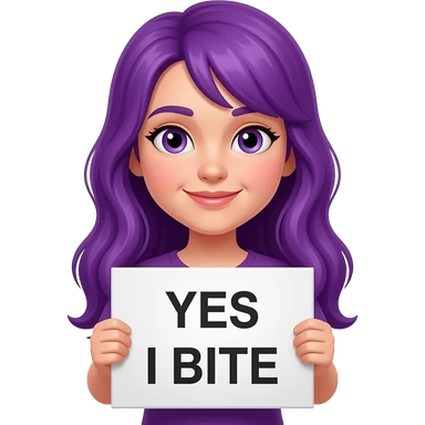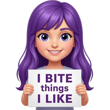girl with long purple hair holding a I BITE things I LIKE sign emoji