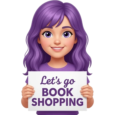 girl with long purple hair holding a Let's go BOOK SHOPPING sign emoji