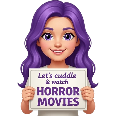 girl with long purple hair holding a Let's cuddle & watch HORROR MOVIES sign emoji