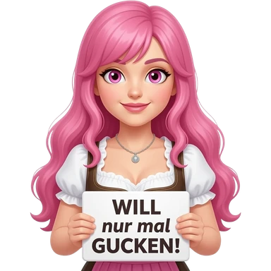 sexy girl with long pink hair and pink eyes wearing a dirndl holding a WILL nur mal GUCKEN! sign emoji