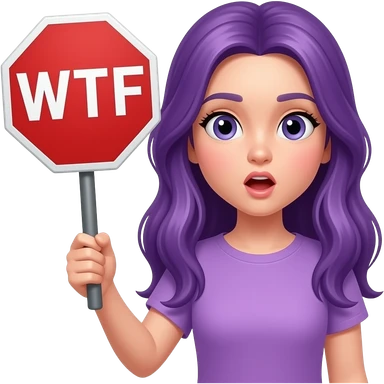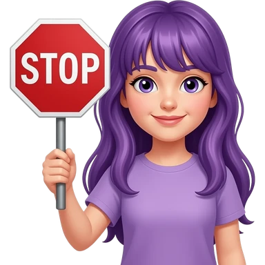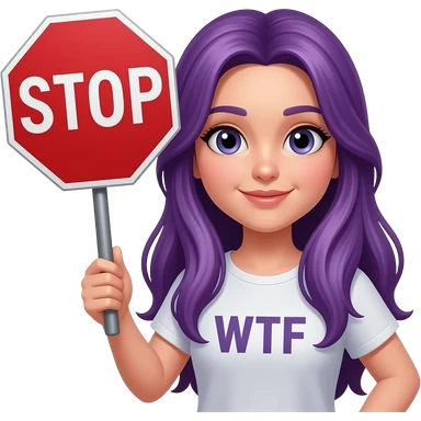girl with long purple hair holding a STOP looking so GOOD... WTF sign emoji