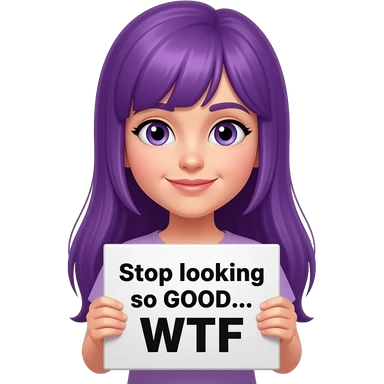 girl with long purple hair holding a Stop looking so GOOD... WTF sign emoji